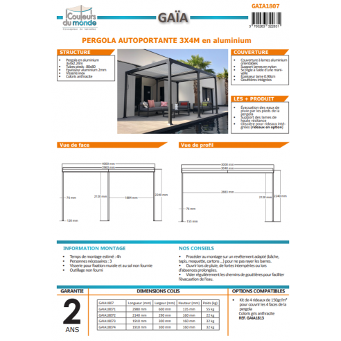 ","attr":{"id":"netreviews_tab","class":"netreviews_tab"},"moduleName":"netreviews"}],"allow_oosp":1,"category":"tonnelles-de-jardin","category_name":"Tonnelles de jardin","link":"https://www.serres-et-abris.com/5268-pergola-bioclimatique-autoportante-gaia-3-x-4-m.html","attribute_price":0,"price_tax_exc":2491.666667,"price_without_reduction":2990,"reduction":0,"specific_prices":false,"quantity":0,"quantity_all_versions":0,"id_image":"fr-default","features":[{"name":"Longueur","value":"4 m","id_feature":"3","position":"0"},{"name":"Largeur","value":"3 m","id_feature":"4","position":"1"},{"name":"Hauteur","value":"2.20 m","id_feature":"37","position":"4"},{"name":"Structure du produit","value":"Aluminium","id_feature":"6","position":"12"},{"name":"Couverture","value":"Toiture fixe en lames aluminium orientables ru00e9glables u00e0lu2019aide du2019une manivelle – u00c9paisseur lame 0.90cm","id_feature":"7","position":"29"},{"name":"Garantie du produit","value":"2 ans","id_feature":"39","position":"34"},{"name":"Information","value":"Ecoulement des eaux de pluie par les pieds","id_feature":"65","position":"65"},{"name":"Produit compatible","value":"Kit 4 rideaux, ru00e9f. GAIA1813","id_feature":"67","position":"67"},{"name":"Marque","value":"COULEURS DU MONDE","id_feature":"123","position":"113"},{"name":"Type de produit","value":"Pergola","id_feature":"54","position":"133"}],"attachments":[],"virtual":0,"pack":0,"packItems":[],"nopackprice":0,"customization_required":false,"rate":20,"tax_name":"TVA FR 20%","ecotax_rate":20,"unit_price":"","customizations":{"fields":[]},"id_customization":0,"is_customizable":false,"show_quantities":false,"quantity_label":"Article","quantity_discounts":[],"customer_group_discount":0,"images":[{"bySize":{"small_default":{"url":"https://www.serres-et-abris.com/33483-small_default/pergola-bioclimatique-autoportante-gaia-3-x-4-m.jpg","main_url":"https://www.serres-et-abris.com/33483/pergola-bioclimatique-autoportante-gaia-3-x-4-m.jpg","main_size_width":4032,"main_size_height":3024,"type_image":"image/jpeg","width":98,"height":127},"cart_default":{"url":"https://www.serres-et-abris.com/33483-cart_default/pergola-bioclimatique-autoportante-gaia-3-x-4-m.jpg","main_url":"https://www.serres-et-abris.com/33483/pergola-bioclimatique-autoportante-gaia-3-x-4-m.jpg","main_size_width":4032,"main_size_height":3024,"type_image":"image/jpeg","width":125,"height":162},"home_default":{"url":"https://www.serres-et-abris.com/33483-home_default/pergola-bioclimatique-autoportante-gaia-3-x-4-m.jpg","main_url":"https://www.serres-et-abris.com/33483/pergola-bioclimatique-autoportante-gaia-3-x-4-m.jpg","main_size_width":4032,"main_size_height":3024,"type_image":"image/jpeg","width":236,"height":305},"large_default":{"url":"https://www.serres-et-abris.com/33483-large_default/pergola-bioclimatique-autoportante-gaia-3-x-4-m.jpg","main_url":"https://www.serres-et-abris.com/33483/pergola-bioclimatique-autoportante-gaia-3-x-4-m.jpg","main_size_width":4032,"main_size_height":3024,"type_image":"image/jpeg","width":492,"height":492},"medium_default":{"url":"https://www.serres-et-abris.com/33483-medium_default/pergola-bioclimatique-autoportante-gaia-3-x-4-m.jpg","main_url":"https://www.serres-et-abris.com/33483/pergola-bioclimatique-autoportante-gaia-3-x-4-m.jpg","main_size_width":4032,"main_size_height":3024,"type_image":"image/jpeg","width":452,"height":584},"thickbox_default":{"url":"https://www.serres-et-abris.com/33483-thickbox_default/pergola-bioclimatique-autoportante-gaia-3-x-4-m.jpg","main_url":"https://www.serres-et-abris.com/33483/pergola-bioclimatique-autoportante-gaia-3-x-4-m.jpg","main_size_width":4032,"main_size_height":3024,"type_image":"image/jpeg","width":1100,"height":1422}},"small":{"url":"https://www.serres-et-abris.com/33483-small_default/pergola-bioclimatique-autoportante-gaia-3-x-4-m.jpg","main_url":"https://www.serres-et-abris.com/33483/pergola-bioclimatique-autoportante-gaia-3-x-4-m.jpg","main_size_width":4032,"main_size_height":3024,"type_image":"image/jpeg","width":98,"height":127},"medium":{"url":"https://www.serres-et-abris.com/33483-large_default/pergola-bioclimatique-autoportante-gaia-3-x-4-m.jpg","main_url":"https://www.serres-et-abris.com/33483/pergola-bioclimatique-autoportante-gaia-3-x-4-m.jpg","main_size_width":4032,"main_size_height":3024,"type_image":"image/jpeg","width":492,"height":492},"large":{"url":"https://www.serres-et-abris.com/33483-thickbox_default/pergola-bioclimatique-autoportante-gaia-3-x-4-m.jpg","main_url":"https://www.serres-et-abris.com/33483/pergola-bioclimatique-autoportante-gaia-3-x-4-m.jpg","main_size_width":4032,"main_size_height":3024,"type_image":"image/jpeg","width":1100,"height":1422},"legend":"Achat COULEURS DU MONDE – Pergola bioclimatique autoportante GAu00cfA – 3 x 4 m","cover":"1","id_image":"33483","position":"1","associatedVariants":[]},{"bySize":{"small_default":{"url":"https://www.serres-et-abris.com/107243-small_default/pergola-bioclimatique-autoportante-gaia-3-x-4-m.jpg","main_url":"https://www.serres-et-abris.com/107243/pergola-bioclimatique-autoportante-gaia-3-x-4-m.jpg","main_size_width":null,"main_size_height":null,"type_image":0,"width":98,"height":127},"cart_default":{"url":"https://www.serres-et-abris.com/107243-cart_default/pergola-bioclimatique-autoportante-gaia-3-x-4-m.jpg","main_url":"https://www.serres-et-abris.com/107243/pergola-bioclimatique-autoportante-gaia-3-x-4-m.jpg","main_size_width":null,"main_size_height":null,"type_image":0,"width":125,"height":162},"home_default":{"url":"https://www.serres-et-abris.com/107243-home_default/pergola-bioclimatique-autoportante-gaia-3-x-4-m.jpg","main_url":"https://www.serres-et-abris.com/107243/pergola-bioclimatique-autoportante-gaia-3-x-4-m.jpg","main_size_width":null,"main_size_height":null,"type_image":0,"width":236,"height":305},"large_default":{"url":"https://www.serres-et-abris.com/107243-large_default/pergola-bioclimatique-autoportante-gaia-3-x-4-m.jpg","