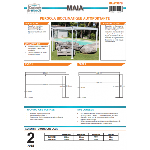 COULEURS DU MONDE – Pergola MAÏA 3×3 m – Autoportante bioclimatique